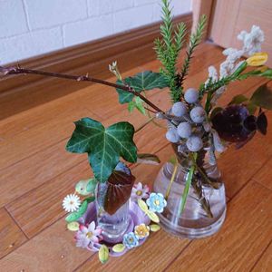 お花のサブスクで、月に2回、500円程度のミニ花束が💐届きます。その中で枯れずに残っているものや、我が家の八重咲きベゴニアを合わせて飾っています。灰色のバーゼリアは、子どもたちに『ナウシカの世界みたい☆』と人気です🌿 880円+税ほどの花瓶ですが、とてもいけやすい形で気に入っています。 横のピンク色はキャンドル用のトレーだと思いますが、鳥ちゃんがいて可愛らしく🐦コショウかなにかの小瓶を置いて、小さな花など(今回は八重咲きベゴニア)を飾っています。 ベゴニアって、水に挿してるだけで、勝手に根っこが生えてきました。とても生命力強いんだと、初めて知りました。