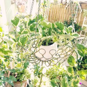 雑貨店で気に入って購入したハンギング💖 シャビーで繊細なワイヤーの感じが好き💖 お天気なのでポトスenjoyさんを乗せて日光浴💖