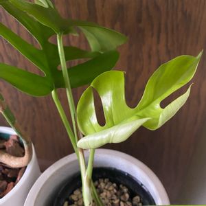 姫モンステラの新しい葉っぱ✨ なんと優しいグリーンの色なんだろう😍 無事に開いて、嬉しい😆💕 誘引しないで、もう少しこのままで大丈夫なのだろうか… 高さ出さずに育てる事は可能なのかなぁ… わからない事だらけ…😅トホホ