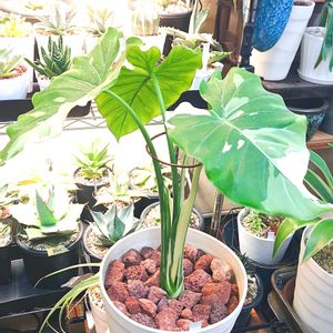 斑入りクワズイモ! 沖縄シルバーです。ホームセンターにあったどでかい斑入りクワズイモは6万したので流石に手が出ず、、せっかくなら小さいのから自分で育てようとお迎えしました! 何年後になるかわからないけど立派になるの楽しみにしてるよ〜