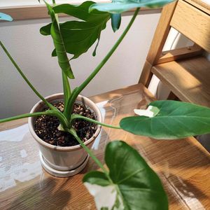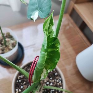 新芽展開中のクワズイモ。斑入りだけど、この子は光にあてても全然葉焼けしない。強い子💪