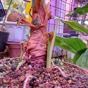 昨日の生産農家さんから 斑入りクワズイモをいただきました。 新芽がたくさん出ていて楽しみです!✨ 昨日は、最高気温27℃で暑くて冷房入れました。 今日も暑いです。💦