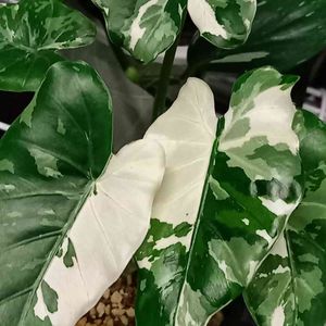 アロカシアオドラバリガリータ 沖縄シルバー 種から育てた(実生)うっすら班入りを頂きました(*´꒳`*) うっすらすぎて目を凝らさなきゃ分からないけど、辛うじて3枚入ってる 小芋も可愛い💕 成長と共に班も増えるのかな?がっつり日に当てた方がいいのかな? 分からない事だらけだ お迎えしたばかりだからとりあえず室内で 今週末には鉢に入れたろっと これからが楽しみなクワズイモちゃん