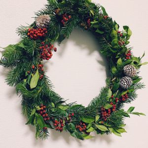クリスマスのドアリース完成しました。もみの木で作られたシンプルなリースを買い、ボリュームを出すためにさらに数種のグリーンを足しました。 黄金ヒバ、juniper/ジュニパー(セイヨウネズ)、ホワイトパイン、木のツルのボール、手芸用フェイクの小鳥、赤いサテンのリボンなどを合わせています。いい香りがします。