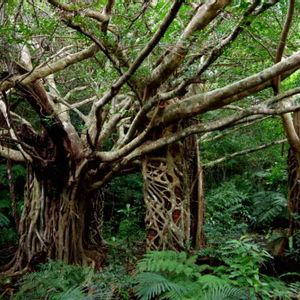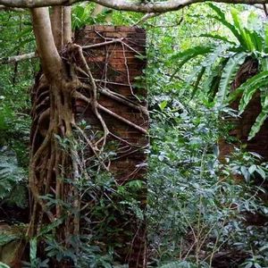 亜熱帯の森の中、人口建造物に取り付いたのはアコウの木。通称、絞め殺しの木というそうです。 元のレンガが見えなくなる日もそう遠く無いようです。