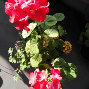 おはようございます😊 今日も、朝からいい天気です‼️😄 寄せ植えですが、ゼラニウム、2種類、カランコエ、ルビーネックレスも入っています✌️😆 赤のゼラニウムは、去年の今頃、花が咲いた状態で、道路に捨てられていたそうです‼️😅 色んな経緯を経て、ウチにやって来ました😊💕 花が終わってから、根が出たのを確認して、寄せ植えにしました☺️ 寄せ植えにしてから花が咲くのは、初めてなので、嬉しいです😆💕💕