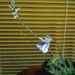 今晩は〜😊 ハオルチアの花が咲き始めました😄👌💕💕 花茎が長く伸びてから咲くので、なかなか全体を撮すのは難しいです✌️😅💦💦 下に写っているのは、同居しているスミレです😆💕💕 ベランダ組ですが、写真が撮りにくいので、今だけ中で…😄🎶