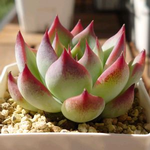 いろんな色を纏うブルーサプライズ。 外葉のエッジはほんのり赤く、中心に近い葉は緑になり始めて、はー美しい(*´∀`*).:*♡ もう少しむっちりさんにしたいなあ。 2枚目 コロラータ×静夜。 2年前、初めて購入した交配式が書かれた苗。 静夜を探してマルシェに行くも静夜は見つからず、コロラータってなんだ?×ってなんだ?と訳もわからないのにGreen Daysさんでお迎えした子。 ずーっと緑色だったのに、最近、色白べっぴんさん。 3枚目 名前問題の静夜さんのその後。 可愛いけどやっぱり静夜ではないよね(。-_-。)