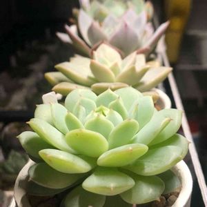 うちの多肉たち 南向き朝8時から日の入りまで直射日光ガンガン!無遮光です☀️ すぐしなしなだから2,3日に一回水あげてます😋 1ヶ月前に少し葉焼けして、最近小さいのが又少し焼けたけど、、みんな丈夫です💪🏻 今のところこのサイズの子はジュレもなし! 緑も可愛い💕大きくなーれ😊✨