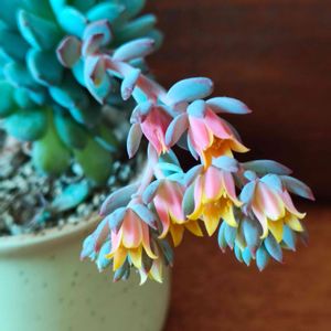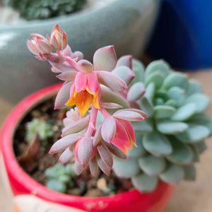 ここ数年、虹の玉に花が咲くようになりました。 全部じゃなくて、気まぐれに😅 多肉の寄せ集め鉢、とっても賑やか🤭