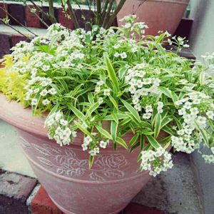 プリペットの根元に植えたスーパーアリッサム。モリモリになってきました!(^^)! ビオラとの寄せ植えは、食われてしまいほぼ消失しましたが、こちらはセダムを押しのけて豪快な感じです。