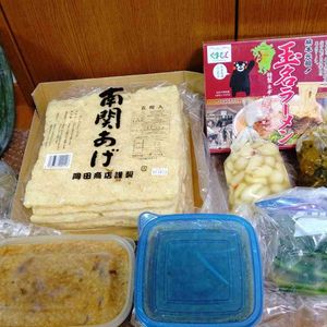 夕飯食べてたらピンポ~ン 故郷の友人から又々🍉 南関あげ(有名らしいTVでも紹介)ラーメン ここからは友人作 スイカ らっきょう、茄子の辛子麹漬け、キュウリの芥子漬け、手作り味噌、味噌漬けと大好きな高菜漬け、早速スイカを😋👌 いつもいつも有難い💕
