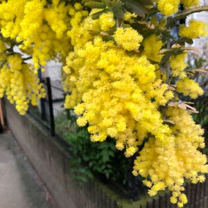 今日のお花 《ミモザ》 よ〜く見るとまぁるい黄色塊が🟡 いくつも抱っこし合ってますね 私の大好きな花です 一枚目は家の近くの遊歩道のミモザです 川沿いの素敵な遊歩道です 夜散歩の時にパチリ (過去pic) 二枚目はお散歩の時よそのお宅に咲いてるものを撮らせていただきました