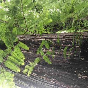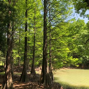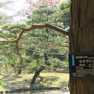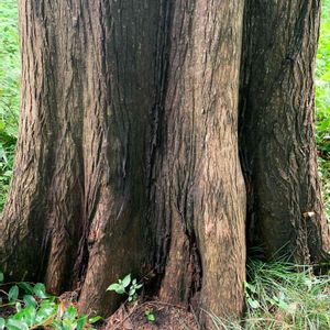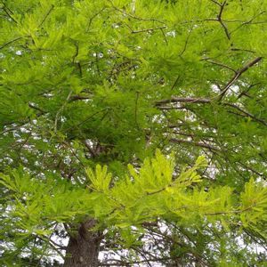 ラクウショウ(Taxodium distichum) 秋になると葉が羽のように落ちるので、落羽松と書いてラクウショウ。 ちなみにマツ科ではなくヒノキ科。 別名ヌマスギという名の通り、少し冠水しているくらいの湿潤地を好む。 地面からタケノコのように生えているのは、気根と呼ばれるもので、湿った土地でも根腐れしないように地中から出てきている。 木材は湿気に強いので、船を作る時とかに使われることもある。