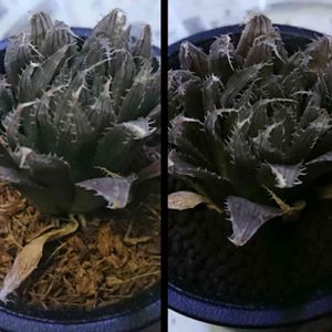 ハオルチア 植え替え&お迎え 大きめの鉢だと思ったけど、ブラックベルティアナには小さかった…ポット植えでぎちぎちよりはましか。 ブラックベルティアナ (T.Dold sn Tsomo) Sheilam オブツーサ錦 雪の華 ブラックベルティアナ 7034RIB0076 St.Alban's ex Eden-Plants 雫石