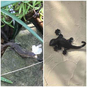 左 ホンモノ カナヘビさん👀蛾捕まえて 嬉しそう 右 ニセモノ 前に買っておいたトカゲ 塀に取り付けてみた(笑)