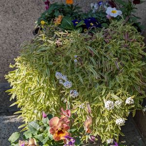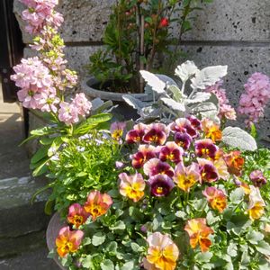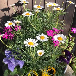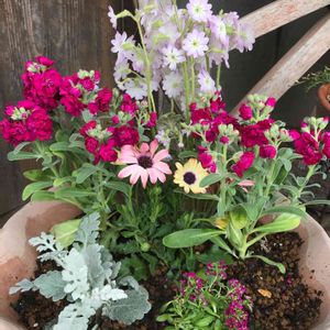 こんにちは。◕‿◕。 今日の2枚目の投稿picは 11月に植えて冬の間ずっと冬眠しているように休んでいたお花が一気に咲き始めた寄植えです でも、暴れてます 暴れてます😆 支柱も使ってます お花の名前🏷タグを付けると画面が真っ黒になるのでコメントに書きますね📝 オステオスペルマム「スミレシオン」 キンギョソウ「ブロンズドラゴン」 斑入り葉キンギョソウ「ダンシングクイーン」 ネメシア 種まきビオラ「ビビ ローズピンクアンティーク」 斑入りセリ「フラミンゴ」 アサギリソウ シロタエギク