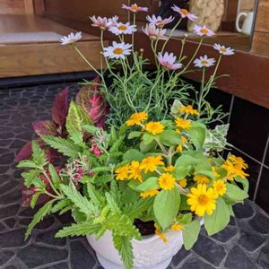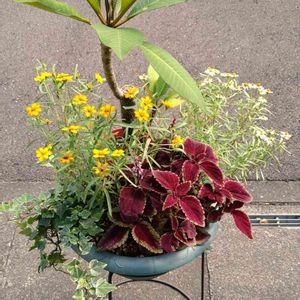 乱れた寄植え😅バランス取る為に咲いた事無いプルメリア入れました🤣 ジニア、コリウス、ヘデラ、プルメリア