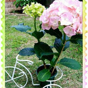 あじさい💕買ってしまいました(*^^*) 写真の奥にあるのが、我が家のあじさい! 一昨年に旦那様にザクザク切られて花が咲かず… 去年は切ってないのに、 まだ花芽がつかず…(・_・、) 寂しくて…💦 ついつい仕事帰りの隣のお花屋さんで300円✨ 淡いピンクの可愛いあじさいです。しばらくしたら地植えしよ~🍀 pic見て気が付いた! 茎にそえぎがついてるんだね~。 お花が重いからね👍