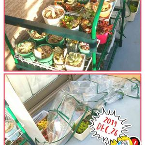 GSの方から今日は風が強いね~との言葉に………仕事だった私は何だか嫌な予感💦 簡易温室は前のビニールをあけて風が通るようにしてきたけど…(°°;) 帰ってすぐベランダへ。 あ、大丈夫大丈夫💕って見ながら… え?あれ?今日は見通しがいいな~…………… ∑(OωO; )ビニールがない! え~飛ばされた?と奥を見ると片足だけ結ばれたヒモでなんとかくっついてました(*´Д`*) 破れたかなーと思いましたが脱げただけで無事でした✨ この前段ボールを挟み込んだ時ヒモを結ばなかったから………反省(_ _ )/ハンセイ 多肉さんは何の変わりもなく棚にならんでいました🌱 良かった~💞