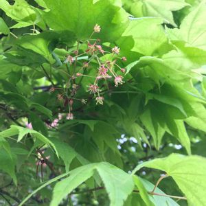 ご近所のカエデのお花とプロペラ。 新緑がとても綺麗でした。 イタヤカエデでしょうか?