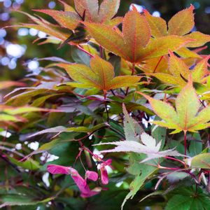 オオモミジの蝉のはねと言う品種でしょうか? 葉っぱが出てから大分長い時間が経ちましたが,始め赤かった若葉ですが,未だすべて緑にはなっておらず,いろいろな色が交わってとても綺麗です。もう実もなっているので,このまま一夏こんな色なんでしょうか?