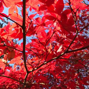 青空に透けた真っ赤なオオモミジ🍁 綺麗でウットリ(*´-`)