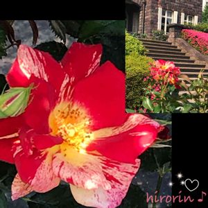 旧古河庭園にて撮影 「きらり」黄色の生地に赤色や白色の絞りが不規則に入る個性的な花色❤️💛❤️🤍❤️💛❤️🤍💚