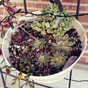 秋田10℃/4℃☁ 寄せ植えはスパルタ管理の普及種🙆 丈夫なので雪があたらない限りベランダ管理です🌵 根付いてるし丈夫です🌵