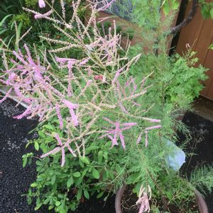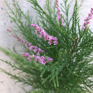 御柳(ギョリュウ) タマリクス・ラモシッシマ 久しぶりに大きな園芸店に 即購入 儚げでいいかな 1mm位の細い針型の葉、花は淡い紅紫色で小さく穂狀に咲く❣️ 塩生植物(塩分が有る所に自生)とは初めて聞く言葉だ👏