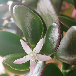 金のなる木 今年はこの1輪だけ咲きました。貴重な花です。 ほんのりピンク色がかわいい でもなぜ、1輪だけなのかなぁ(T_T)