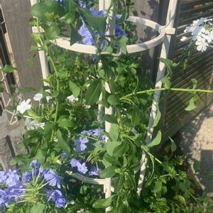 2年目の鉢植えのルリマツリ🤍💜2色の混植にしました。随分成長して枝が暴れるので、オベリスクに誘引してみたけど、うまくできない💦