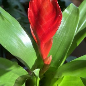 通勤途中にて 先程、通勤途中に咲いているのを見掛けて 撮ったものになりますが… ツヤツヤして赤く大きな花苞に 黄色いお花が咲いていました🌼 2日前に外に置いてあるのを見掛け 最初、葉も花苞もあまりにもツヤツヤしていたので 造花?かと疑ってしまうほどでしたが😅 今朝通ったら咲いていました。 全く知識がないのですが 検索してみたところ、フリーセア属の何か?でしょうか これからたくさん咲いていくと思われますが GWに入ってしまうので見れないかなと思うと 残念ですね