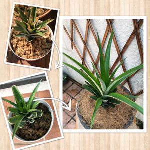 先月に投稿したパイナップル🍍、植え替えました😁 このひと月半の成長っぷり⤴︎ ⤴︎😳 土は、どこに行ったの?と鉢の中は根がグルグル巻いてました🌀 ✋パイナツプル👣👣、✌🏻チヨコレイト👣👣、👊グリコノオマケ👣👣 この遊び、地域によって違うのかな🤔