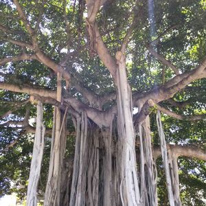 オアフ島の植物たち ①バニヤンツリー ②名前??なんだろう🤔 ③④プルメリアとにかく大きい😳 ⑤ワイキキビーチは夜も賑やかでした✨✨