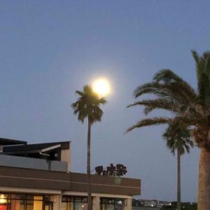 椰子の葉と月。 光でまあるく見えるけど… 半月です。 ミニマーケットの中庭で。