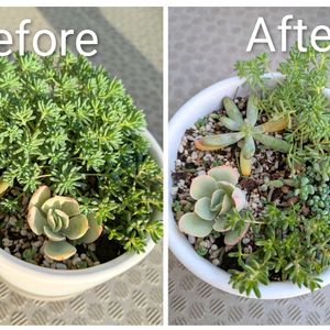 イベントで買った寄せ植えが 育ったので 植え替え2回目 色々植えてあったけど 他の子に負けて成長出来ない子達がいたので ピーチネックレスは育ちすぎ理由で別の鉢へ その他ぜんぜん大きくならずにいた 名前もわからない小さな子達も 根っこごと移動 少し寂しくなったけど また、いつか元の寄せ植えに似せて作ることが出来たらいいな😌 若緑は隙間が何やら黄色っぽいです 何かな~?もしや花✨ 白牡丹は、植え替え時に葉っぱ取れて不恰好になりました😭 ブロウメアナ&パリダムは 元気いっぱいモリモリの為 チョキチョキして減らしました✂️ 後この鉢には、1粒ちょこっとある マジョールみたいな多肉と パリダムの影に 名前不明の多肉が1ついます 頑張って生きてくれ~🙏 大きく育つ事を期待して周辺を少し開けてます