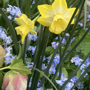 新しい水仙が咲きました。 足元は勿忘草だらけです。 水仙を引き立ててくれる有り難い花です。