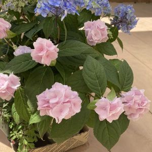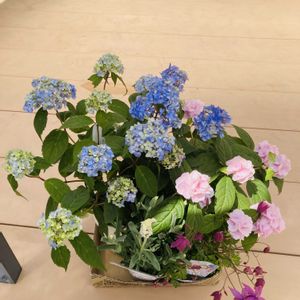 山アジサイ 手前ピンク色 伊予獅子手まり 後ろブルー 津江の小手まり 一番手前 風鈴オダマキ