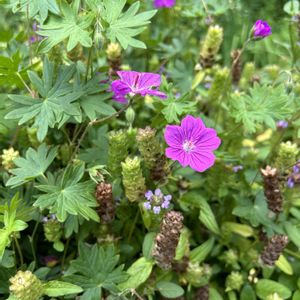 今日のお花🏷️ウツボグサ2景 ①神代植物公園エントランスの花壇で生命力強めのフウロソウ🌸と競う園芸種のウツボグサ。元気いっぱい負けてない(*°∀、°*)2024年06月29日📸 ②高山植物らしくロックガーデンで痩せた儚い風情のシロバナウツボグサ。2024年06月22日📸日光植物園