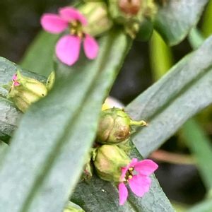 ホソバヒメミソハギ(細葉姫禊萩)ミソハギ科ヒメミソハギ属 花友さんが投稿していたお花、田んぼのそばに咲いていました。 とっても濃いピンクのお花なので遠くからでも目に付きました。 熱帯アメリカ原産の一年生の帰化植物。 葉っぱの十字対生も綺麗です。 茎は高さ30~100cm,無毛,切り口は四角.葉は対生,淡緑色,やや光沢があり,長さ3~8cm,幅0.4~1cm,基部の両側で左右に丸く張り出して茎を抱く.がくは花時には4稜ある短筒型,上縁は4裂,裂間に小突起.果時には球形にふくらみ,上縁の4裂は浅くなる.花弁4個,ほぼ円形,2mm,紫紅色.果実は球形,3~4mm,はじめはがくに包まれ,後に頂部のみ露出,赤褐色で光沢あり.種子は0.3mm. 🏷️ 真っ赤な火曜日