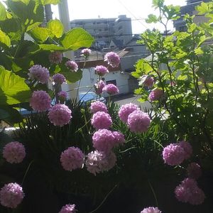 おはようございます☀ 今日のベランダ🎵 アルメリアピンクボール💗 みんな咲き揃いました🎵🎵 ちょっと挟まれてますが😅 適度な影で撮りやすかったです😅😄 また小さな蕾出来てるので 暫く楽しめそうです♡(*^^*ゞ♬♫♪~