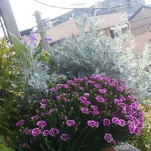こんばんは😃🌃 今日も一日お疲れ様でした<(_ _*)> 今朝はスッキリしない天気でしたが 夕方予報通り雨☔に 日中は台風並みの強風🌀💦💦 薔薇🌹の蕾も何本か折れてしまいました💦 丁度ちびちゃん👯来てたので 「持って帰る?」と他にもたしてママに🎁 GS皆さんのお宅は大丈夫でしたで しょうか? 前にもupしたエレモフィラ٠ニベア💜 お花沢山とっても嬉しいです~⤴⤴ 一緒に寄せ植えしてる葉牡丹✂したところから又お花咲き出したのですが😅😄 踊り葉牡丹作りたいのですが(^-^; 咲かせず直ぐに✂した方がいいですか?