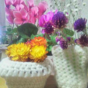 春イチゴさんから刺激を受けて 久しぶりに編み物しました シンプルだけど楽しかった♪*。 奥のシクラメンは鉢植えで 他はドライです。