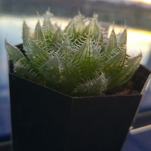 昨日、お迎えした新しいハオファミリー 羽衣さん Haworthia tessellata 羽衣さんは葉が薄くトンガリ系で ノギと呼ばれているトゲの様なものが ついているのが特徴😁 葉が薄い分、他の子に比べると水あげの 頻度は少し多め、先端の窓の透けと ノギがキラキラっとして綺麗です。 ノギは触ってみたら全然痛くありません😆 以後、よろしくお願い申し上げます😄