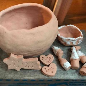 今頃だけど... tsukiさんのwsで作った テラコッタ鉢が焼きあがり 谷っちさんが届けてくれたよ〜 もう1週間も前だけど オバール型の鉢が欲しくて シンプルに作ってみた とんがり屋根のおウチも作ったけど 出来上がりは たけのこの里(笑) チマチマ寄せ用のリーフ鉢 ピックも可愛い焼き上がり💕 tsukiさんありがとう(*⁰▿⁰*)