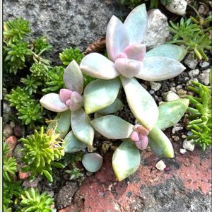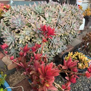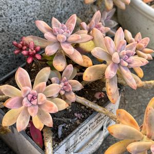 ①②多肉寄せ…クスミカラー? うちでは数少ないエケベリア属のダスティローズ✨ 他はグラプトペタルム属 秋麗 朧月 ブロンズ姫など