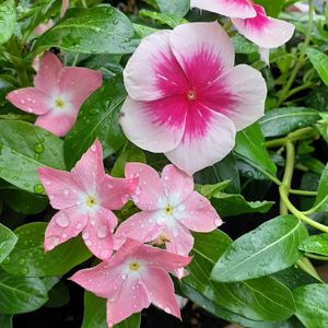 ウチ🏠の日々草達🩷🤍💜🧡 今日は今年植えている日々草を紹介。これだけ暑くても元気に咲いてくれる夏の定番。 ①②ニチニチソウ『ミニナツ』シリーズ。初めてのお迎え。 ①がピーチオレ🍑、②がホワイトチェリー🍒 大きさは日々草の中では中型かな? 同じ白地だけど、①の方がほんのりピンク掛かってる🩷 ③毎年お迎えしている『爽夏』💜🤍 なかなか見かけなくて、ようやく見つけた時には最後の一鉢でした💦 今年のは少し色味が薄くて残念😅 ④ごくオーソドックスな2色🩷🤍 パンチの強い色🩷と定番の白🤍 ⑤前にも投稿した、ウチ🏠の庭では今年の新顔🩷🤍🧡。 上から『ニルバーナカスケード』(ピンクスプラッシュ)🩷…ハイビスカス🌺のような派手さ❣️ 珍しいオレンジ色🧡の『夏みかん』🍊…意外に爽やかな感じ💕 下が『桃のときめき』🍑…ピンクの濃淡が綺麗💓 いづれも初めてのお迎えでした。 朝☀️、水遣り🚿をしてから見ると水を弾いて💦可愛い〜⤴️💕 夏の花壇を元気に爽やかに彩ってくれてます👍✨