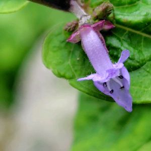 雄しべ4本と雌しべ1本 残念、4本しか見えない て、撮った時 斑紋だと思ってた😅 小さき花には小さき蕊が あるんですね〜👀 上唇が浅く4裂して 筋状斑紋が入る これに似たイヌヤマハッカは 3裂で斑紋もないそうです(∪・ω・)ワンッ こんなに可愛い後ろ姿 3裂だったら サザエさんの頭みたいで もっと可愛いだろうなぁ⋆୨♡୧⋆ ヤマハッカ シソ科 ヤマハッカ属