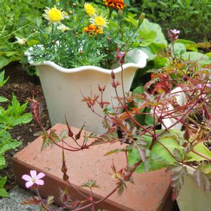 😊pic全体の色あい♪🧱 に・・ホッとする 事に 気づきました・・ *手前の小花は*ヒメフロウというそうです。 雑草?かどうか🤗ぴんく色のちっちゃいお花。🌿の模様も個性的。寄せ植えに入れてみたらまあ!にょきにょきと😃